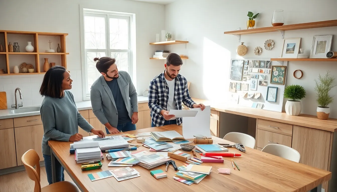 professionals discussing budget-friendly home renovation ideas in a modern living room.